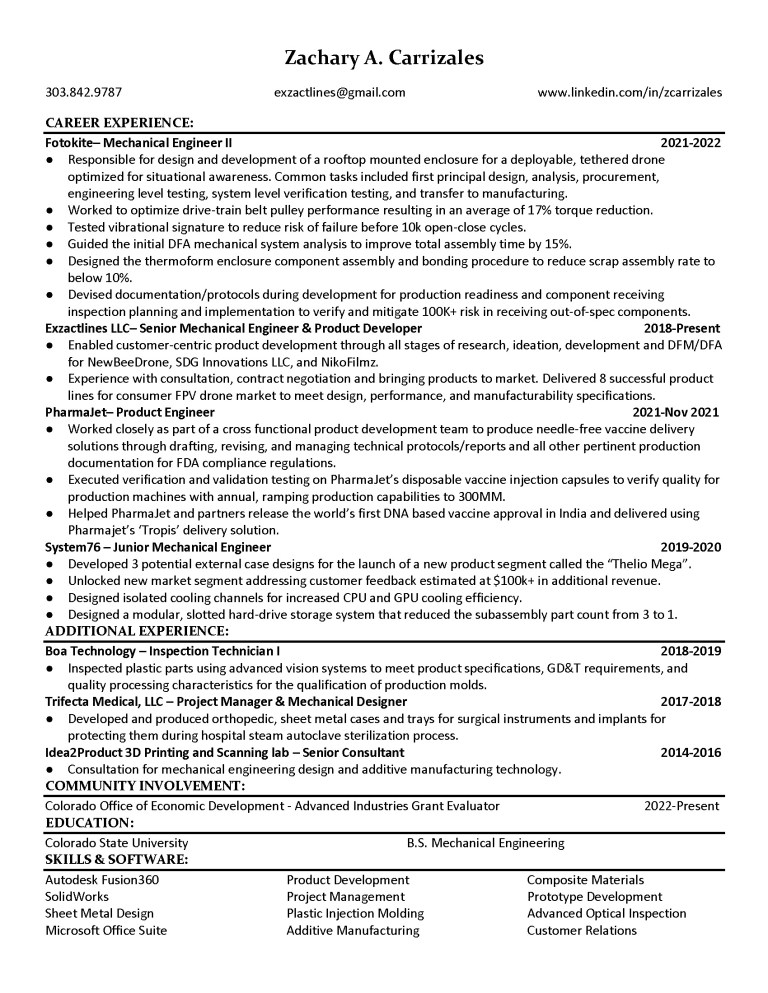 Fotokite– Mechanical Engineer II ExzactLines LLC – Senior Mechanical Engineer & Product Developer 2018-Present System76 – Junior Mechanical Engineer 2019-2020 Boa Technology – Inspection Technician I 2018-2019 Trifecta Medical, LLC – Project Manager & Mechanical Designer 2017-2018 Idea2Product 3D Printing and Scanning lab – Senior Consultant 2014-2016